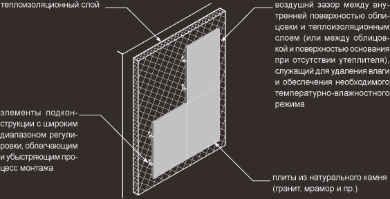 Собранные и закрепленные в соответствии с проектом на строительство здания (сооружения) элементы конструкции образуют навесную фасадную систему с воздушным зазором между внутренней поверхностью облицовки и теплоизоляционным слоем (или между облицовкой и поверхностью основания при отсутствии утеплителя), служащим для удаления влаги и обеспечения необходимого температурно-влажностного режима работы ограждающей конструкции.